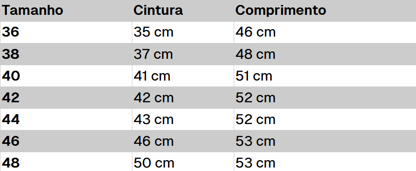 Obs.: As medidas descritas na tabela tem uma tolência média de 1 cm para mais ou para menos.